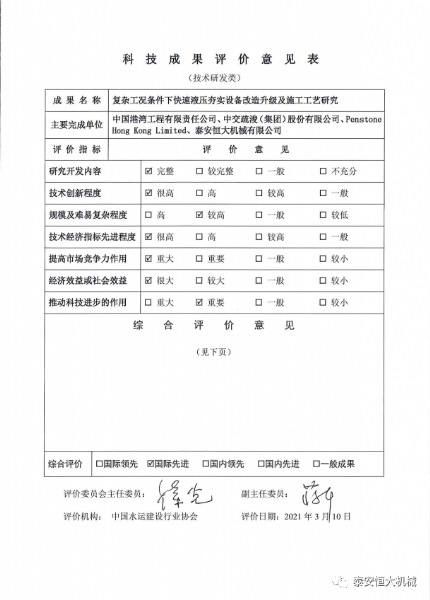 2021年3月10日,中國水運建設(shè)行業(yè)協(xié)會在北京主持召開了由中國港灣工程有限責(zé)任公司、中交疏浚(集團(tuán))股份有限公司、中交第四航務(wù)工程勘察設(shè)計院有限公司、Penstone Hong Kong Limited和泰安恒大機(jī)械有限公司共同完成的“復(fù)雜工況條件下快速液壓夯實設(shè)備改造升級及施工工藝研究”科技成果評價會,評價委員會(名單附后)聽取了項目組的匯報,審閱了研究報告、科技查新報告和應(yīng)用證明等材料。
